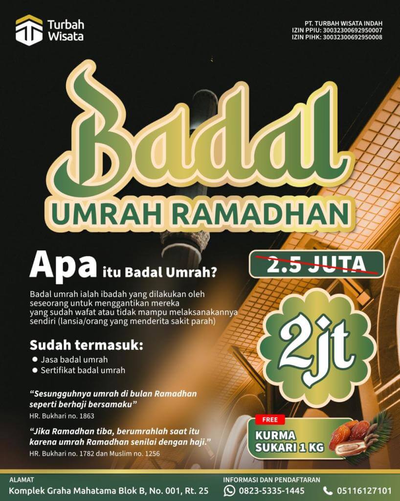 Turbah Wisata merupakan perusahaan travel yang melayani perjalanan ibadah umrah, haji khusus, serta wisata religi ke berbagai negara. Kami memahami setiap proses perjalanan secara menyeluruh sehingga dapat menghadirkan layanan yang terencana dengan baik dan memberikan pengalaman ibadah yang lebih tenang, nyaman, dan berkesan bagi para jamaah.